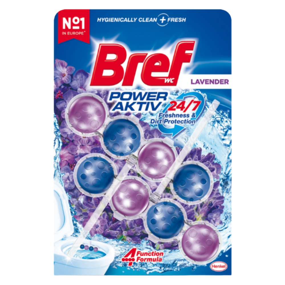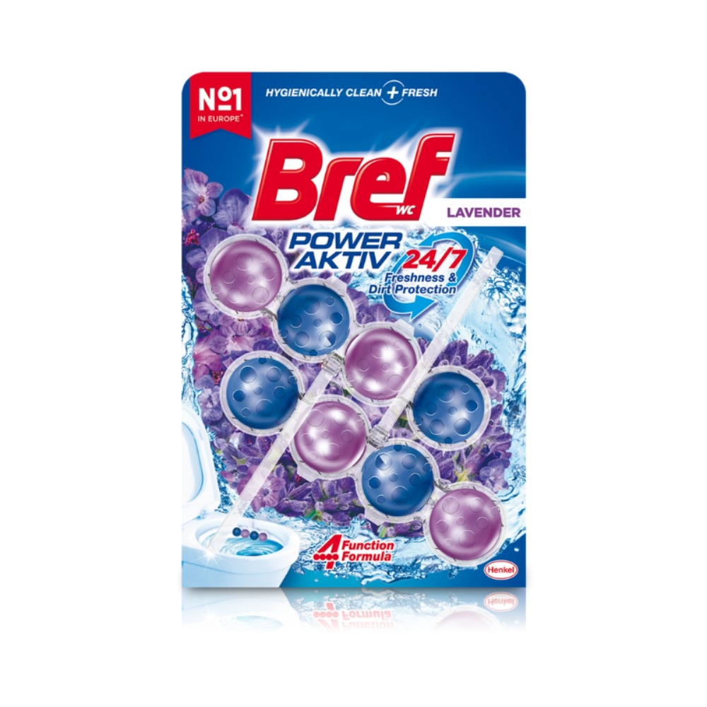 Bref Power Aktiv Lavanta, geliştirilmiş 4 fonksiyonlu formülüyle tuvaletinizde 7/24 ferahlık ve hijyen sağlar. Tuvaletinizi kir ve kireç oluşumuna karşı korur.