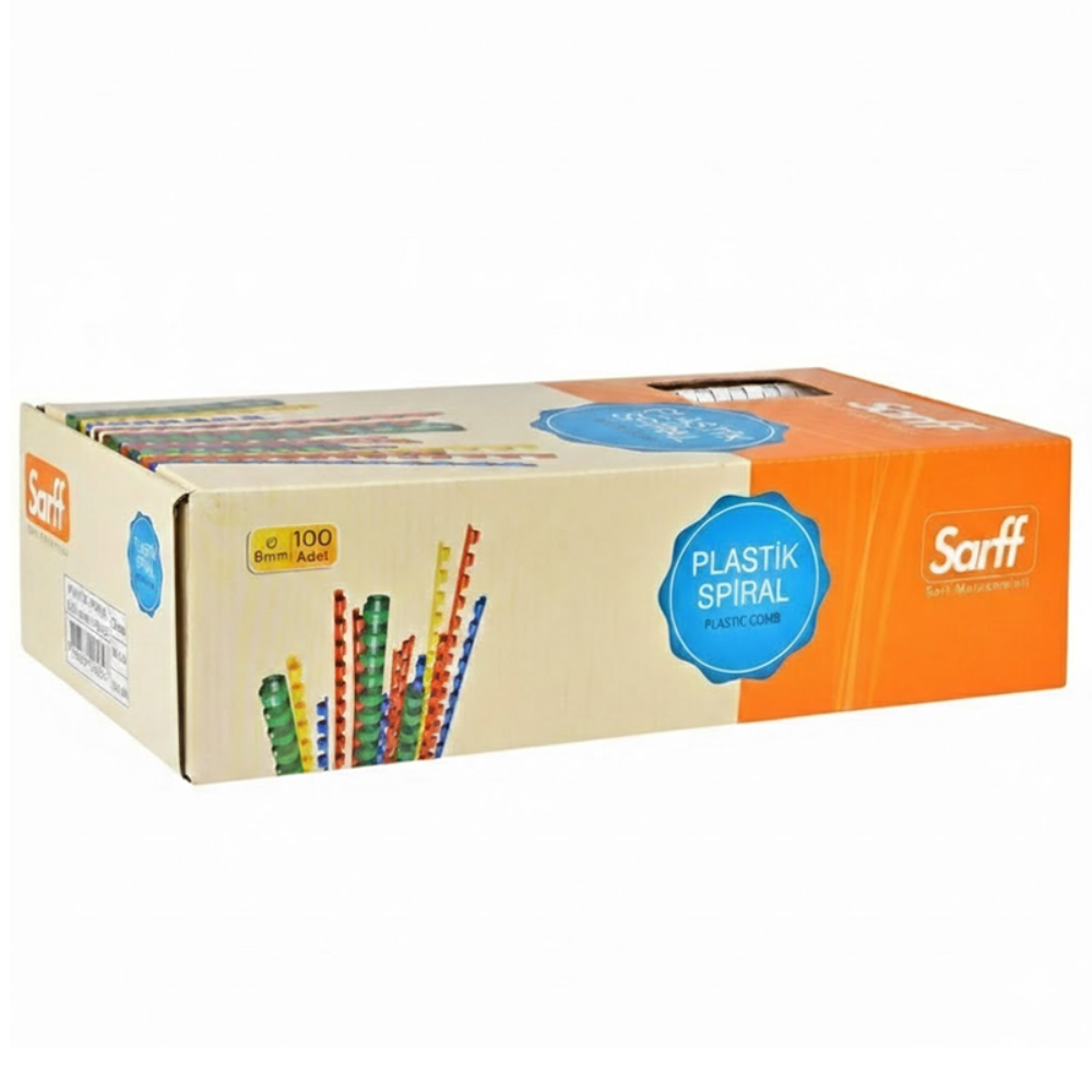 Sarff Plastik Spiral 8 mm, raporlar, sunum dosyaları, ödevler ve projeler için mükemmeldir. Hem öğrenci hem de profesyonel kullanıcılar için idealdir. Ofislerde, eğitim kurumlarında veya evde belgelerinizi düzenli ve şık bir şekilde saklamanıza yardımcı olur